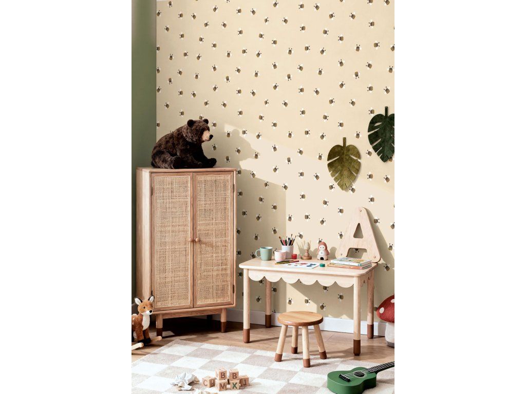 Roztomilá dětská vliesová tapeta na zeď, včelky, béžový podklad, včelky v hnědé, zlaté a bílé.