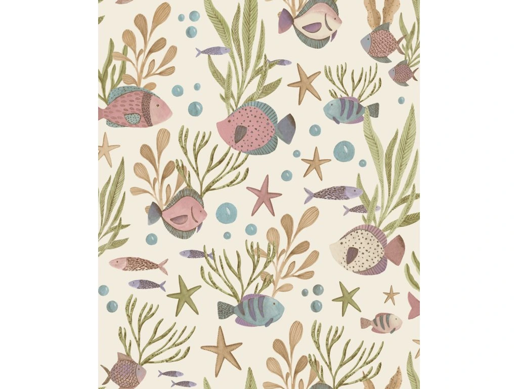 Vliesová tapeta s vinylovým povrchem, světle béžový podklad, motiv podmořského světa v odstínech modré, zelené, hnědé, fialové a růžové, krupičková textura.