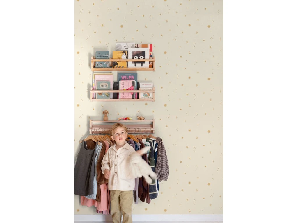 Dětská vliesová tapeta na zeď, krémový podklad, motivy hvězdiček, krupičková textura.