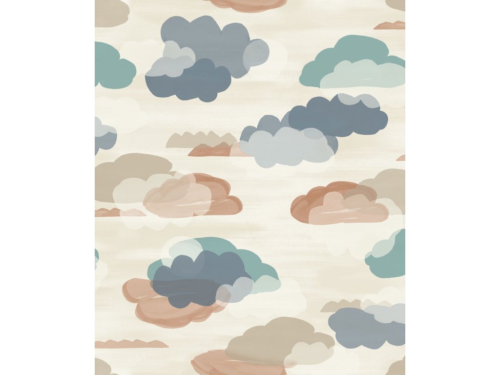 Vliesová tapeta s vinylovým povrchem, šedo-bílý podklad, motiv mráčků v odstínech šedé, zelené, modré, hnědé a béžové, krupičková textura.