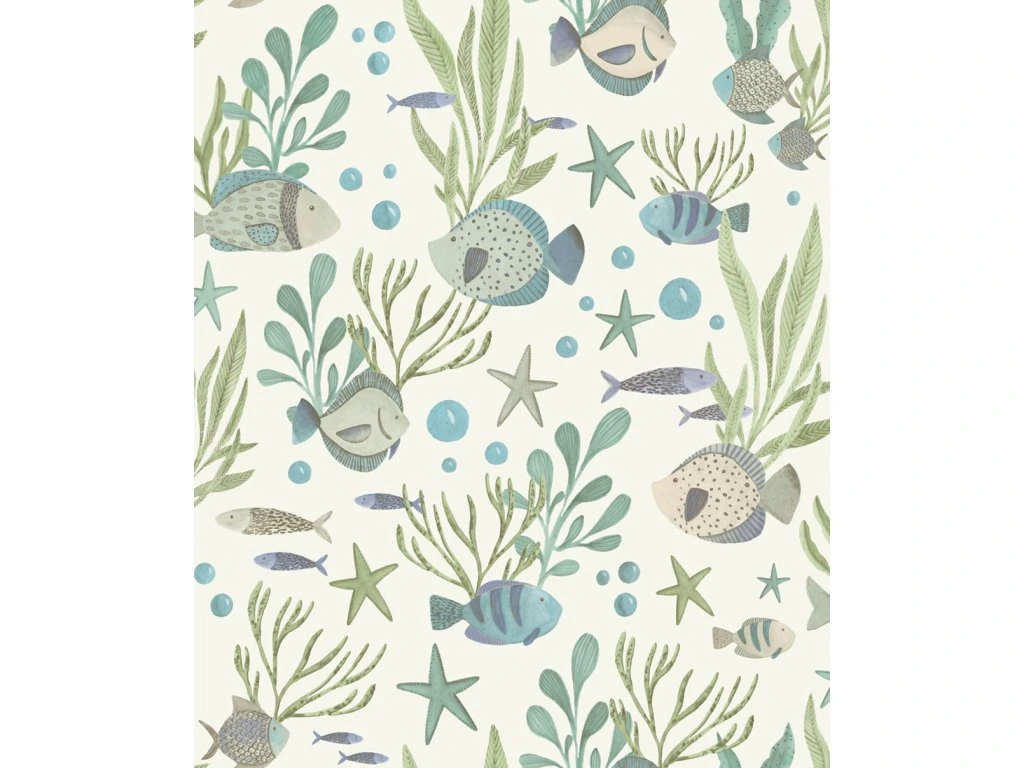 Vliesová tapeta s vinylovým povrchem, bílý podklad, motiv podmořského světa v odstínech modré, zelené, fialové a béžové, krupičková textura.