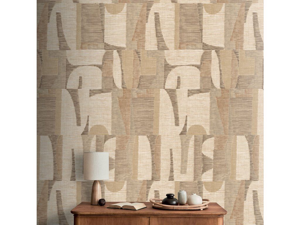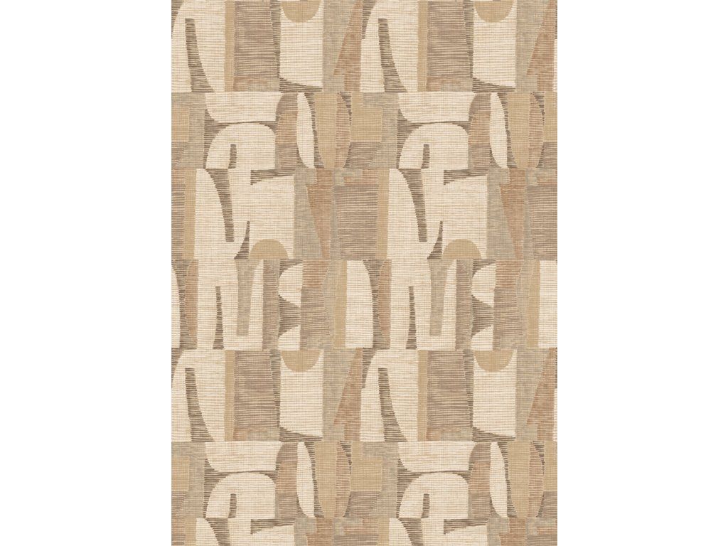 Geometrická vliesová obrazová tapeta na zeď, hrubší látková textura, ve světlých odstínech hnědé, béžové, šedé a žluté.