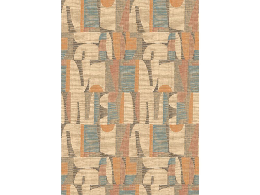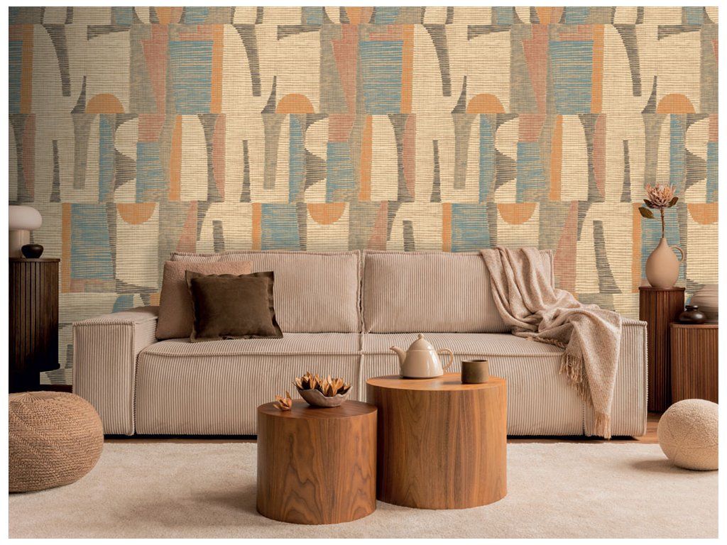 Geometrická vliesová obrazová tapeta na zeď, hrubší látková textura, ve světlých odstínech béžové, hnědé, modré, červené a šedé.