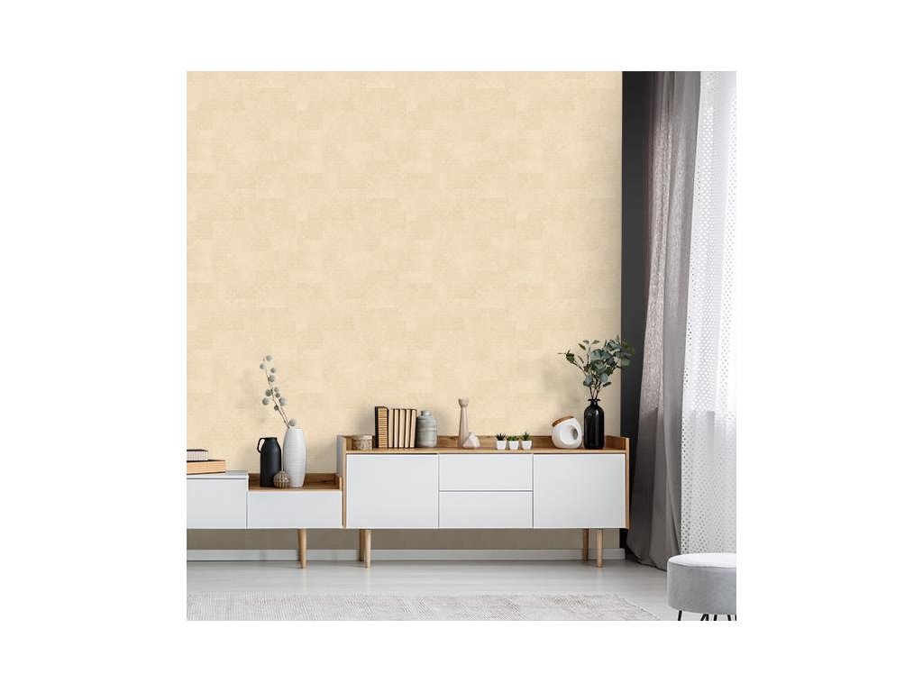 Luxusní vliesová tapeta s vinylovým povrchem, pololesklý podklad v béžových odstínech, drobnější plastický zlato-béžový čtverečkový vzorek, odstíny vytváří plošný geometrický vzor.