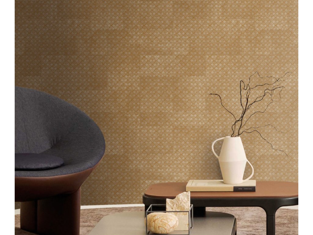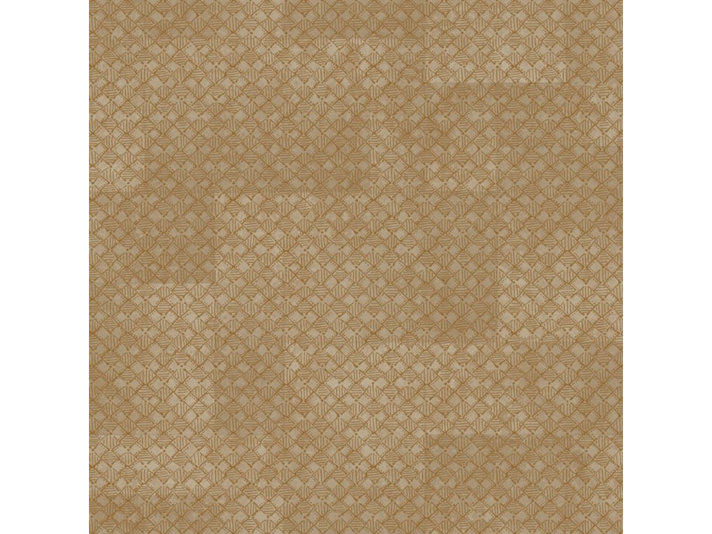 Luxusní vliesová tapeta s vinylovým povrchem, pololesklý podklad v hnědých odstínech, drobnější plastický bronzový čtverečkový vzorek, odstíny vytváří plošný geometrický vzor.