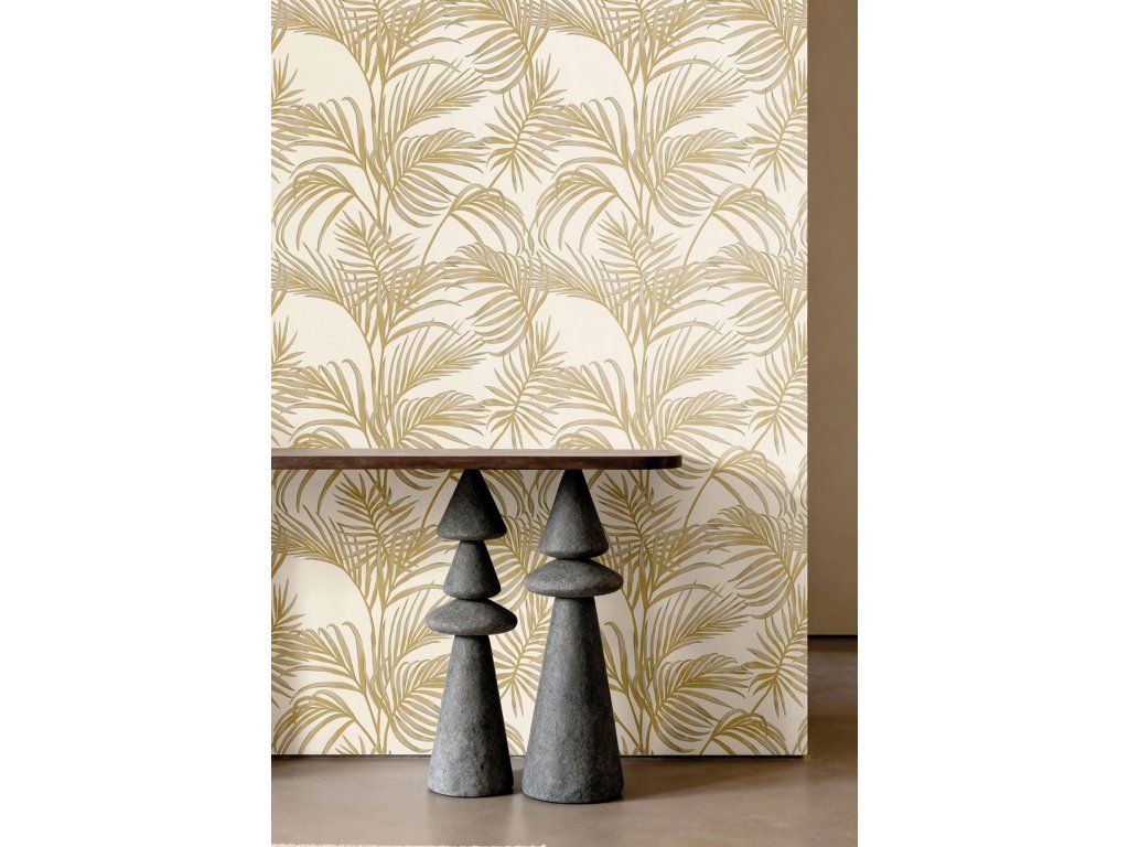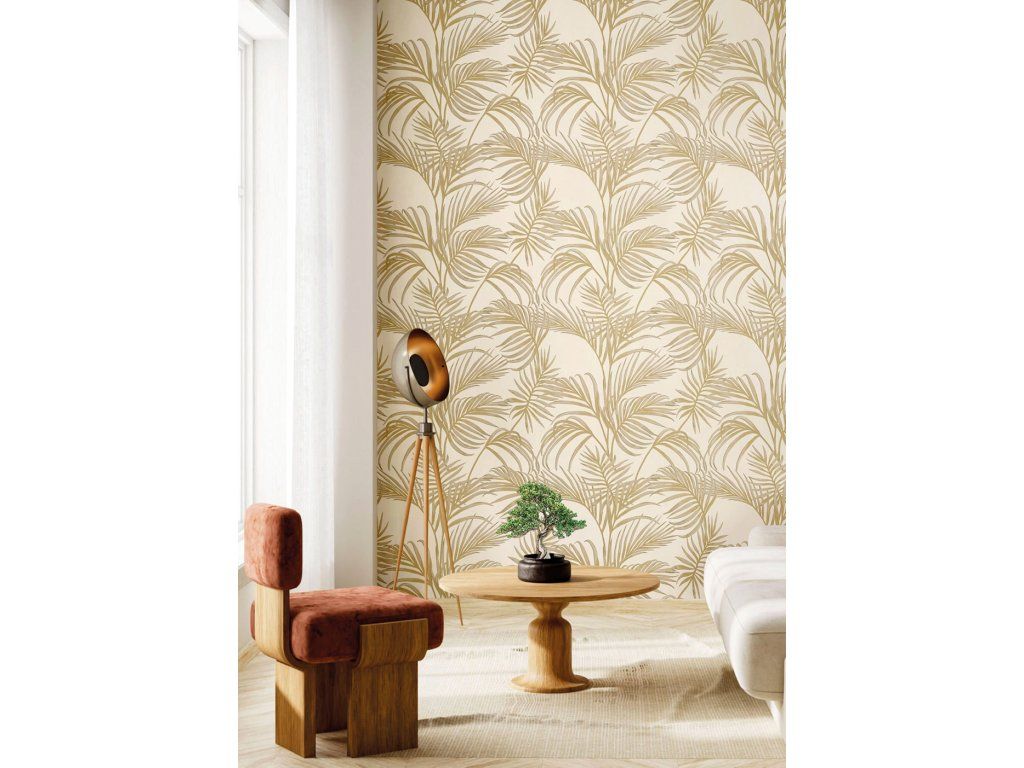 Luxusní vliesová tapeta s vinylovým povrchem, plastické motivy palmových listů, krémovo-béžový podklad s mramorovým povrchem, béžovo-zlaté listy.