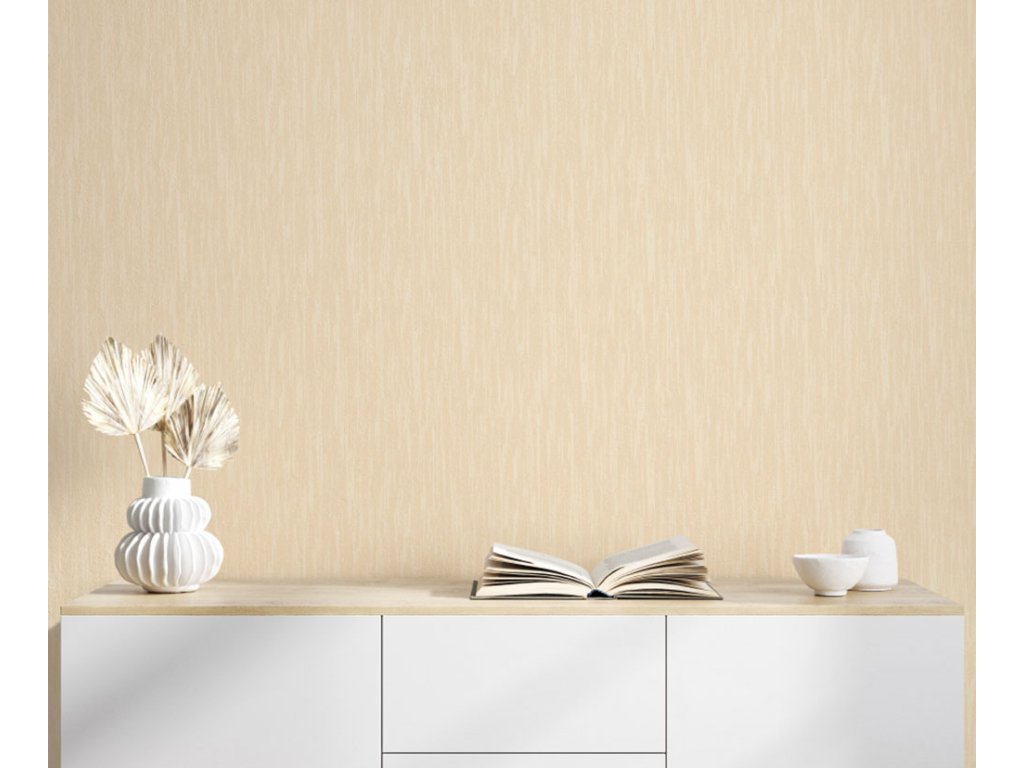 Vliesová tapeta s vinylovým povrchem, odstíny pololesklé béžové se zlatými akcenty, design evokuje hrubší luxusní textilii.