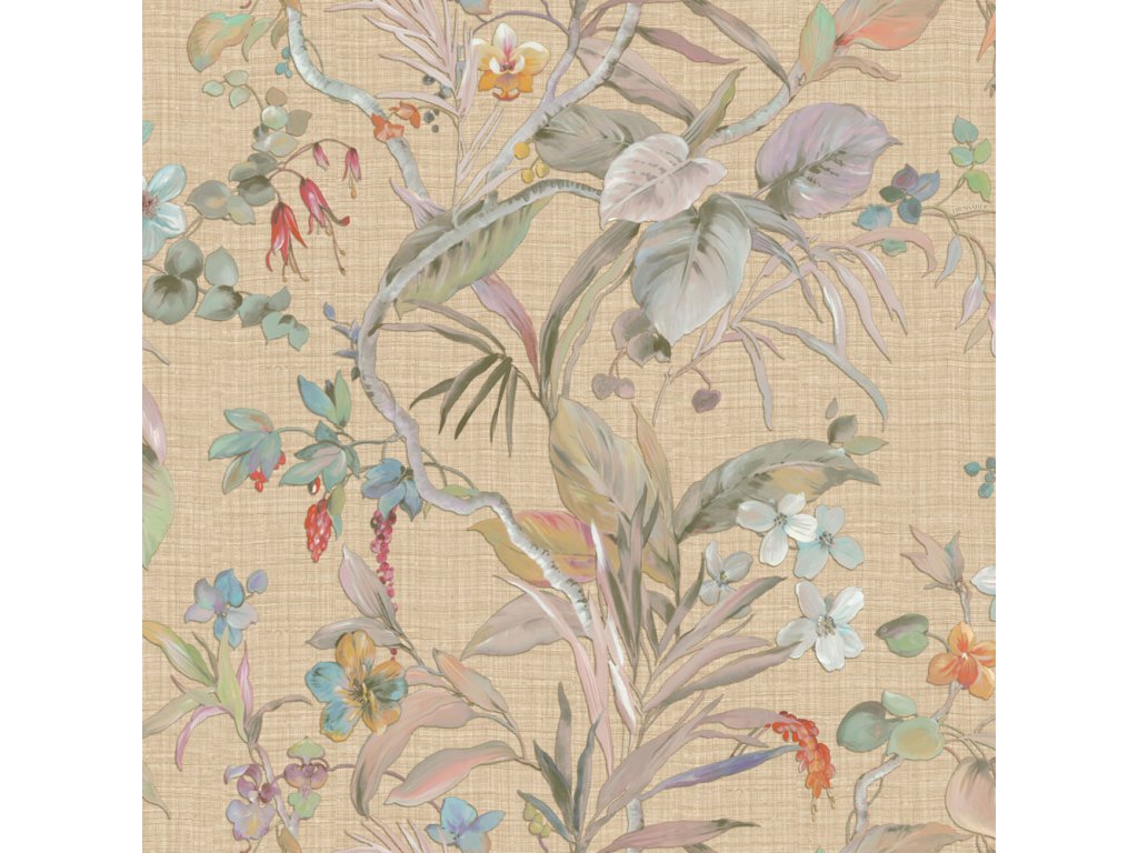 Luxusní vliesová tapeta s vinylovým povrchem, podklad hrubší béžová látková textura, bohatý květinový vzor v pestrých barvách.