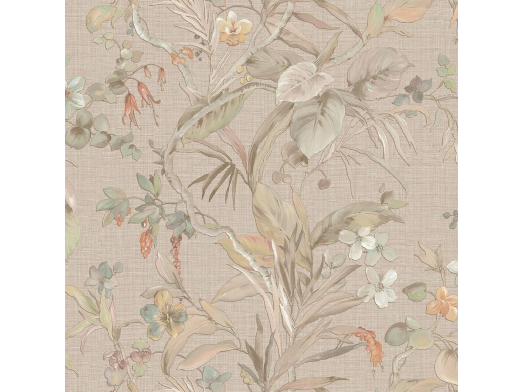 Luxusní vliesová tapeta s vinylovým povrchem, podklad hrubší béžová látková textura, bohatý květinový vzor v jemných odstínech béžové, hnědé, fialové a žluté.
