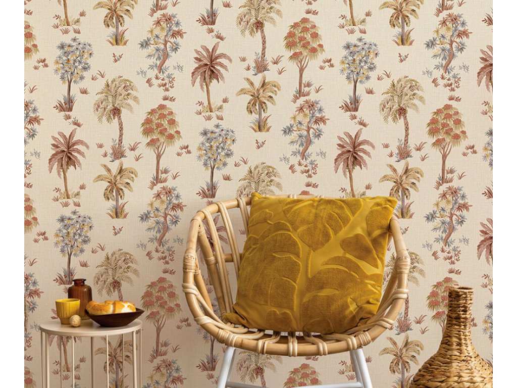 Vliesová tapeta s vinylovým povrchem, béžový podklad, motivy palem, stromů.