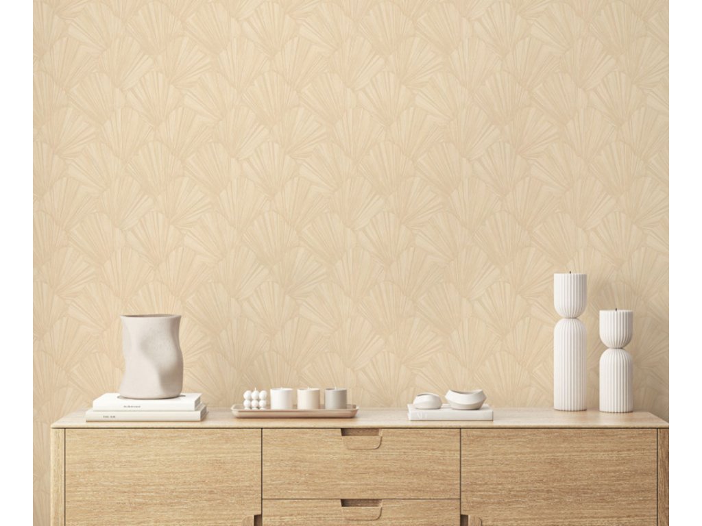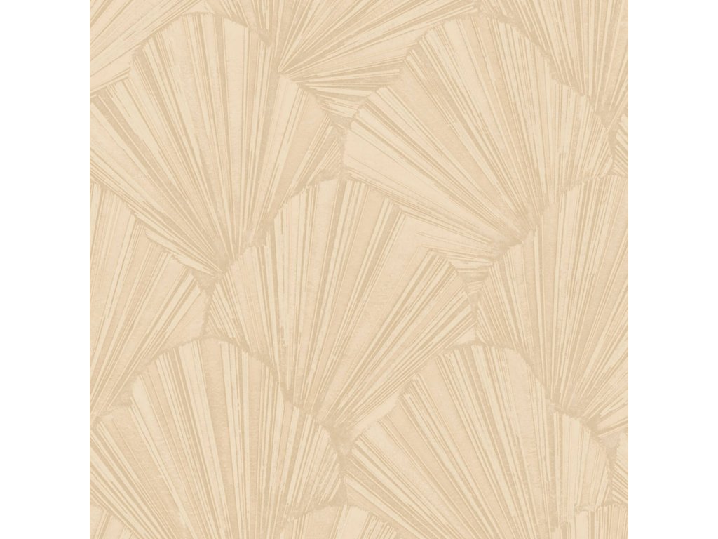 Vliesová tapeta s vinylovým povrchem, odstíny pololesklé béžové se zlatými akcenty, plastický vějířový vzor.