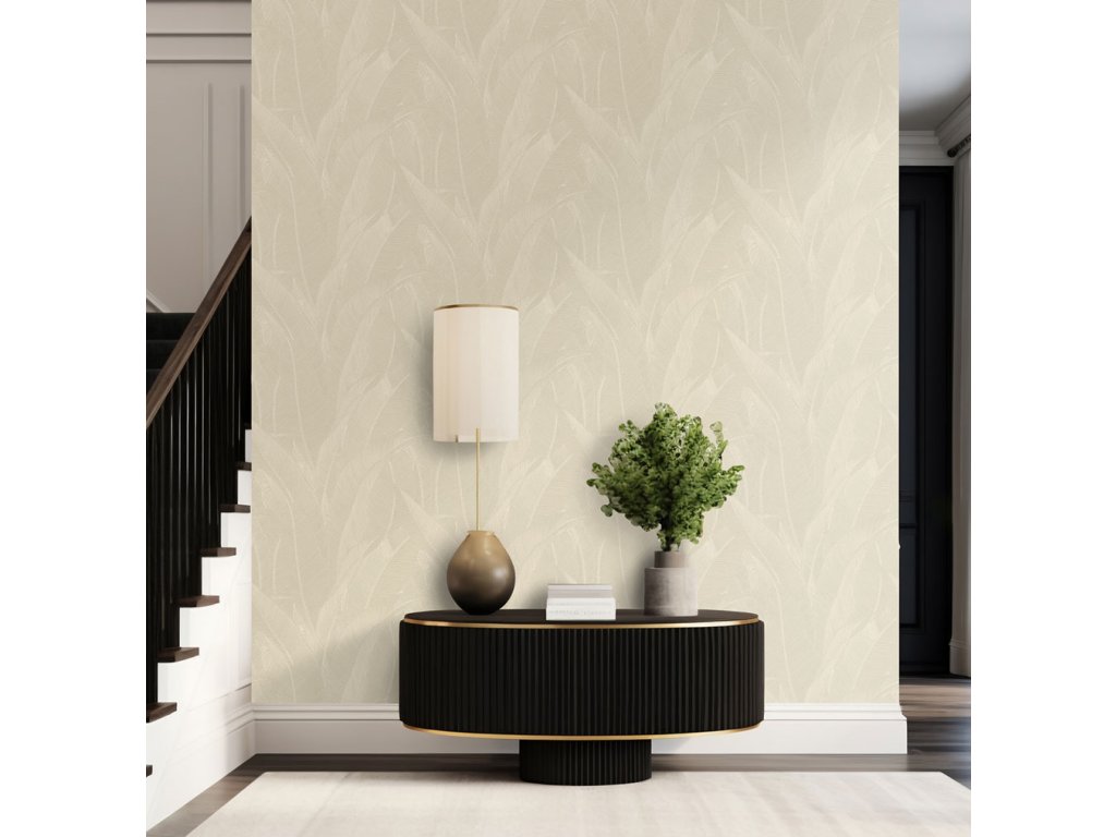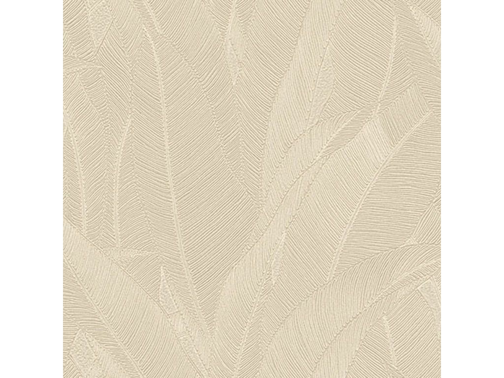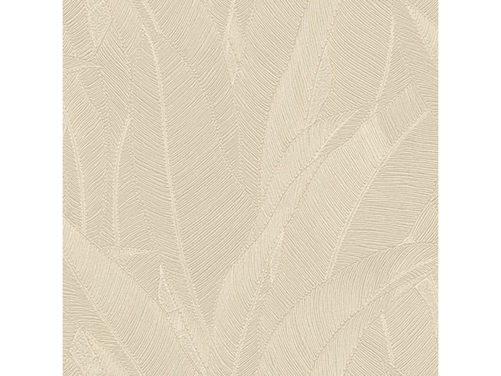 Luxusní vliesová tapeta s vinylovým povrchem, pololesklý béžový podklad, plastické šedo-stříbrné linie tvoří stylizované listy.