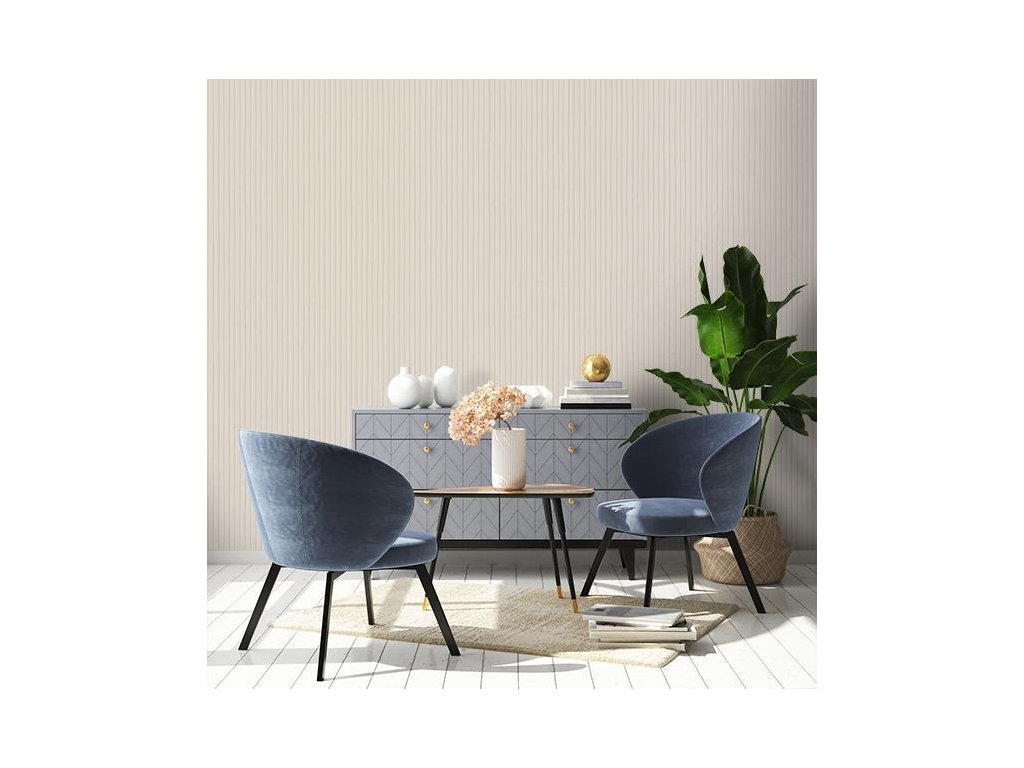 Luxusní vliesová tapeta s vinylovým povrchem, pololesklá textura v krémových odstínech, úzké proužky s vyšším leskem.