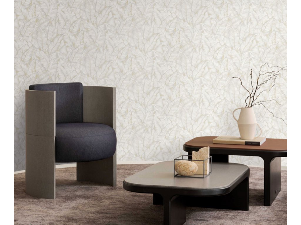 Luxusní vliesová tapeta s vinylovým povrchem, plastické listy v odstínech bílé, šedé a béžové se zlatými odlesky.