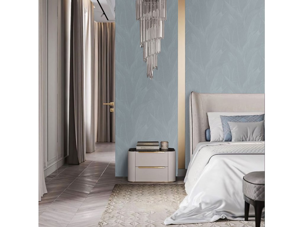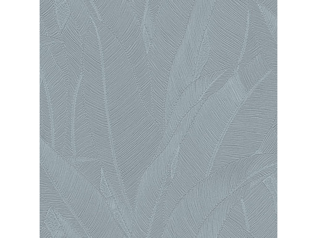 Luxusní vliesová tapeta s vinylovým povrchem, šedo-modrý podklad, plastické stříbrné linie tvoří stylizované listy.