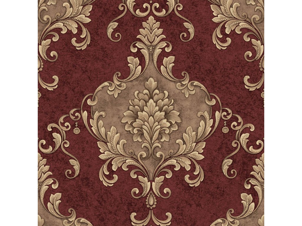 Vliesová tapeta s vinylovým povrchem, odstíny vínově červené s jemným pololeskem, zlatý vzor s drobnými zlatými třpytkami.