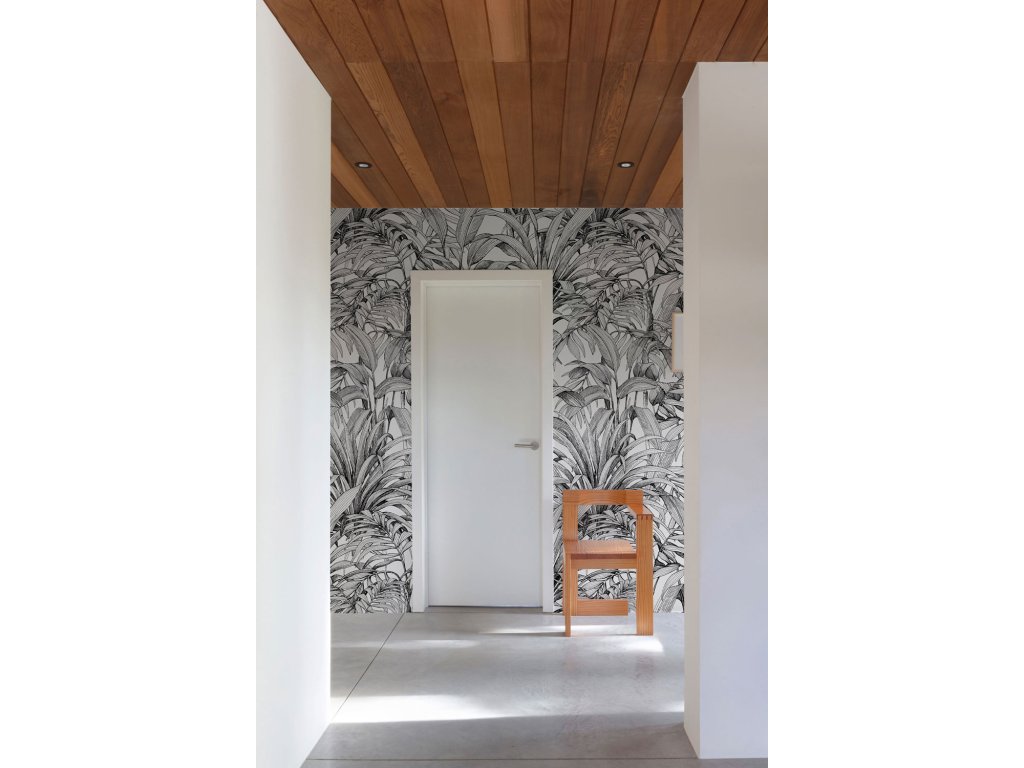 Vliesová fototapeta s vinylovým povrchem, černo-bílý vzor tropických listů.