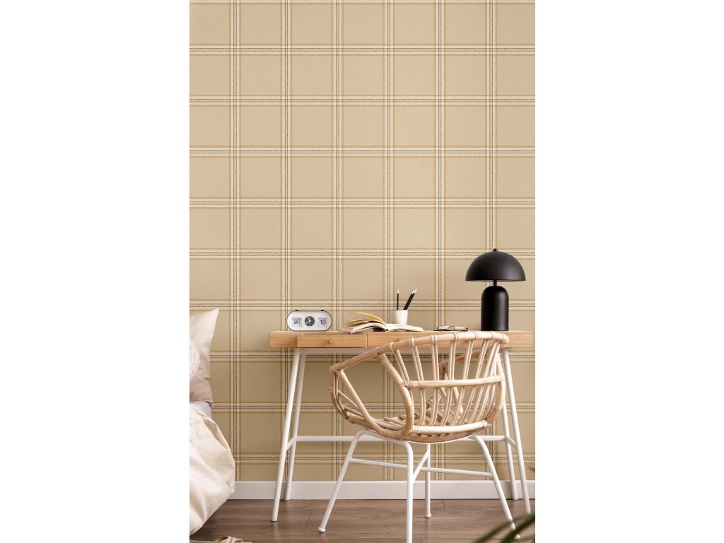 Vliesová tapeta s vinylovým povrchem, imitace kárované látky v odstínech béžové a hnědé.
