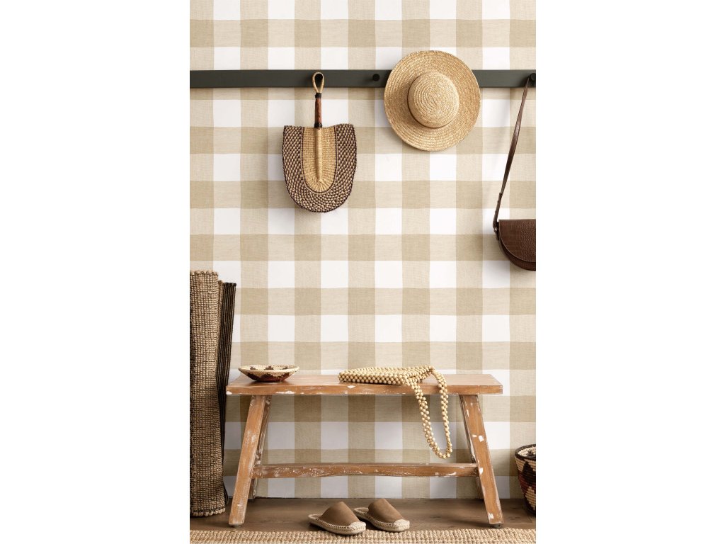 Vliesová tapeta s vinylovým povrchem, imitace kárované látky v odstínech béžové a krémové.