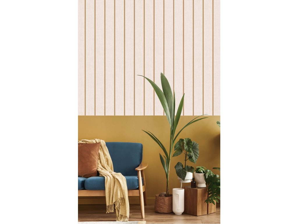 Vliesová tapeta s vinylovým povrchem, pruhy v odstínech béžové a hnědé, látková textura.