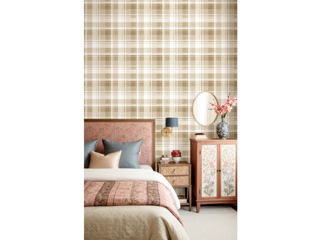 Luxusní vliesová tapeta s vinylovým povrchem, látková textura, vzor evokuje tartanovou látku v béžových odstínech.