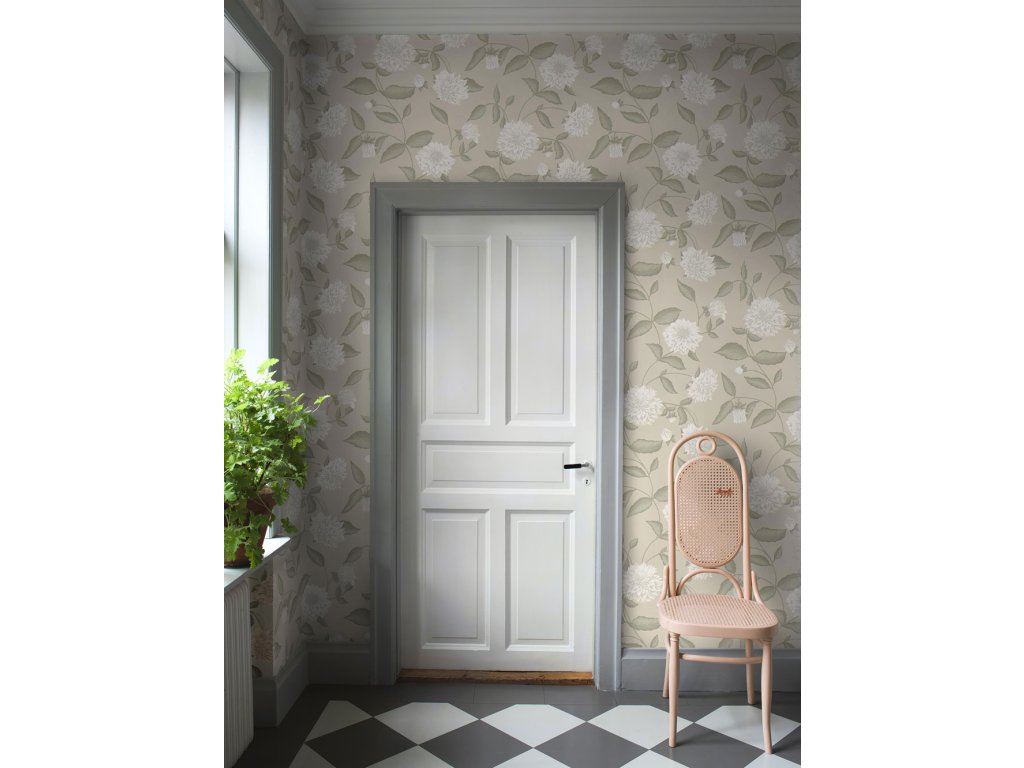 Vliesová tapeta na zeď, béžový podklad, motiv rozkvetlých Jiřin v odstínech zelené a bílé / slonová kost.