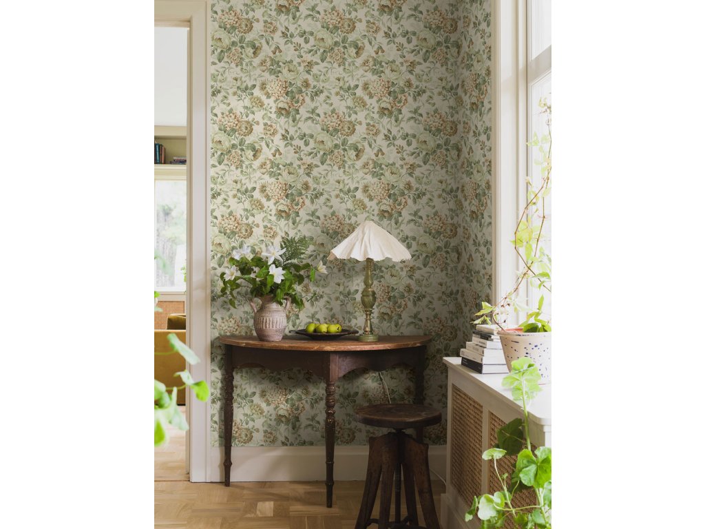 Vliesová tapeta na zeď, béžový podklad, nadčasový květinový vzor s dominujícími Hortenziemi v odstínech zelené, meruňkově růžové, hnědé a béžové.