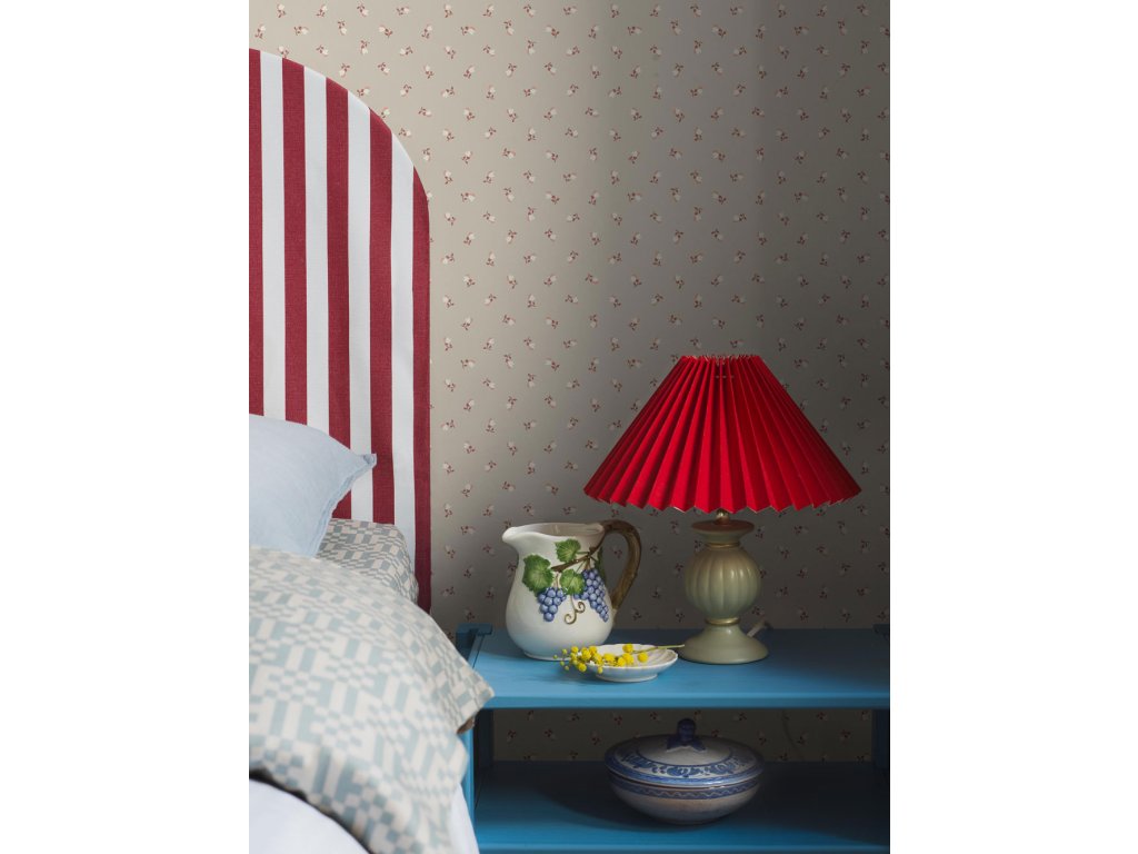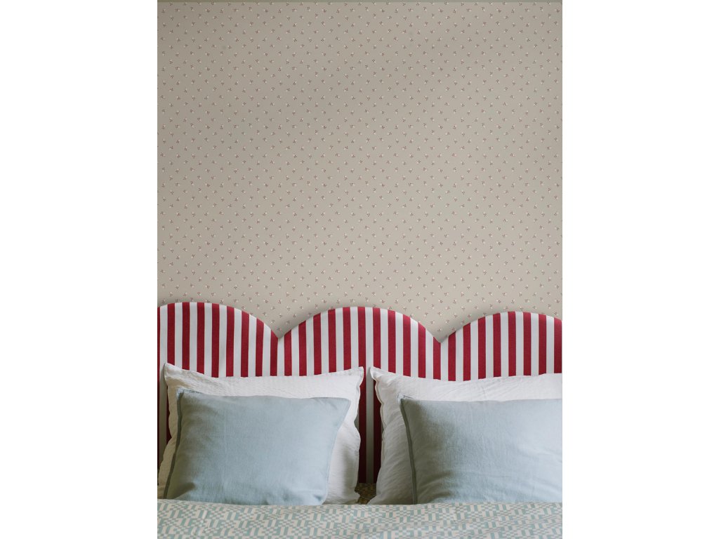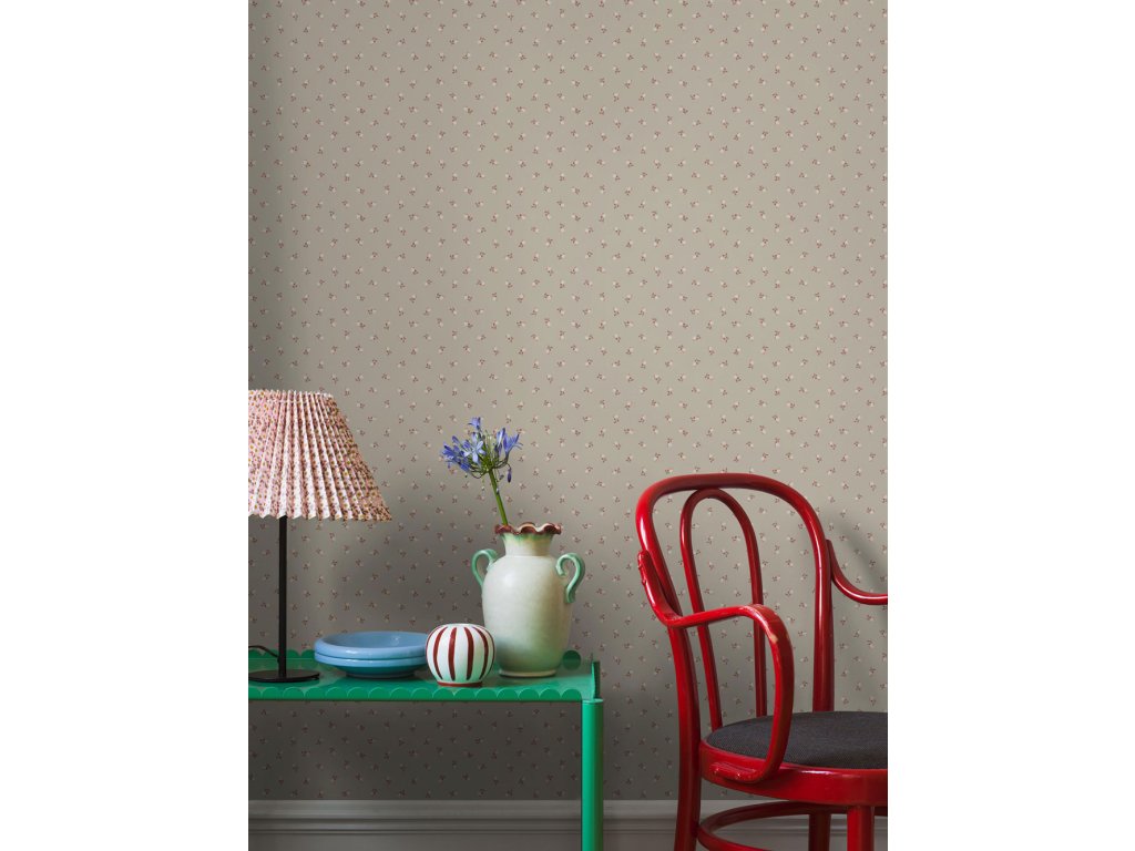 Vliesová tapeta na zeď, béžový podklad, motiv drobných kytiček v odstínech hnědé, růžové a bílé.