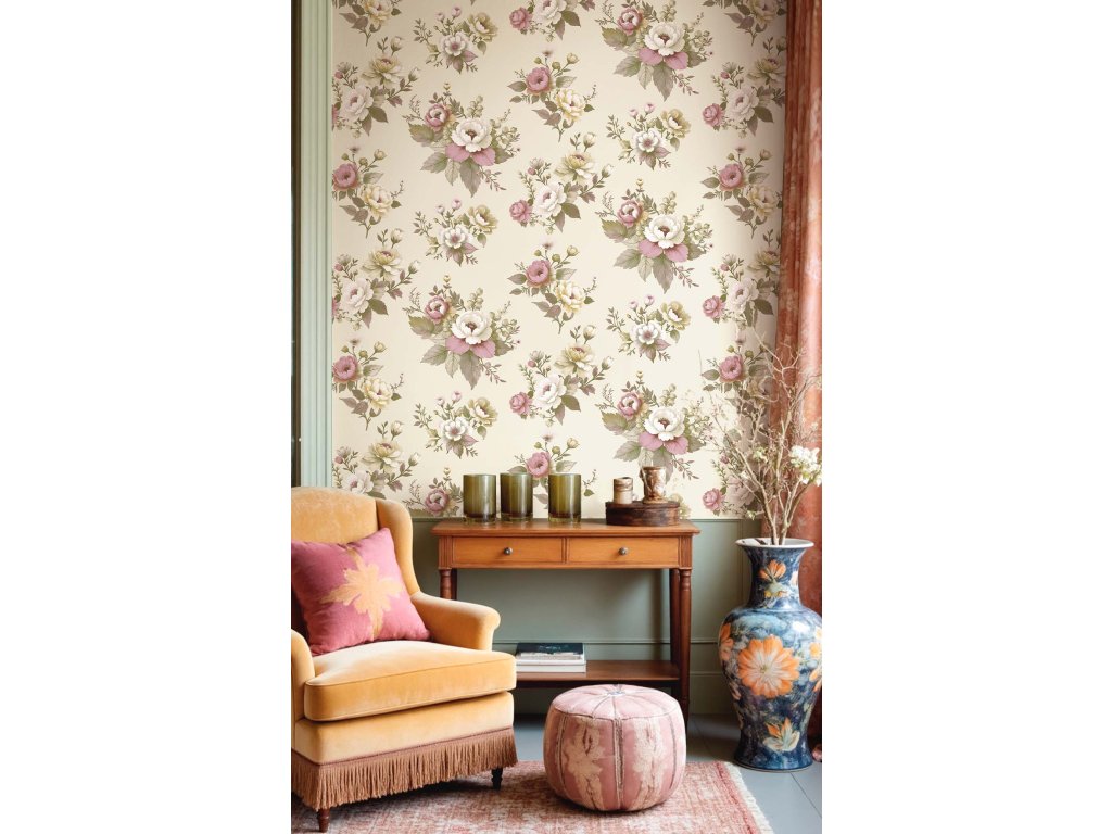 Luxusní vliesová tapeta s vinylovým povrchem, béžový podklad s látkovou texturou, květinový motiv v odstínech hnědé, khaki a starorůžové.