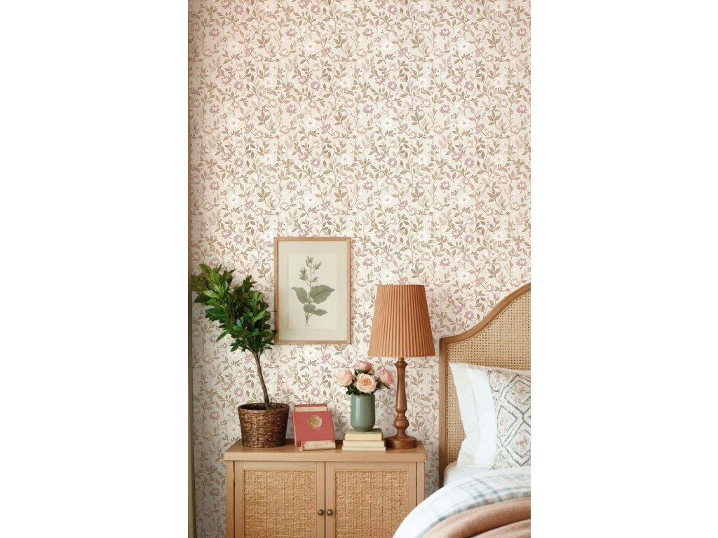 Luxusní vliesová tapeta s vinylovým povrchem, světle béžový podklad, květinový motiv v odstínech růžové, zelené a okrové.