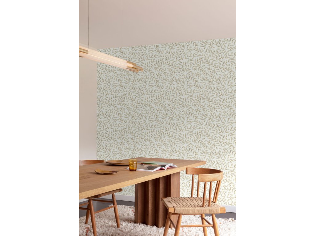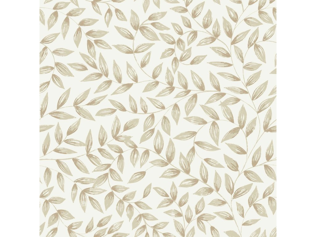 Vliesová tapeta s vinylovým povrchem, bílý podklad, motiv listů v odstínech béžové, jemná textura.
