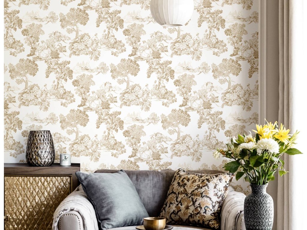 Luxusní vliesová tapeta s vinylovým povrchem, romantický motiv inspirovaný historickými látkami Toile de Jouy, odstíny béžové, látková textura.