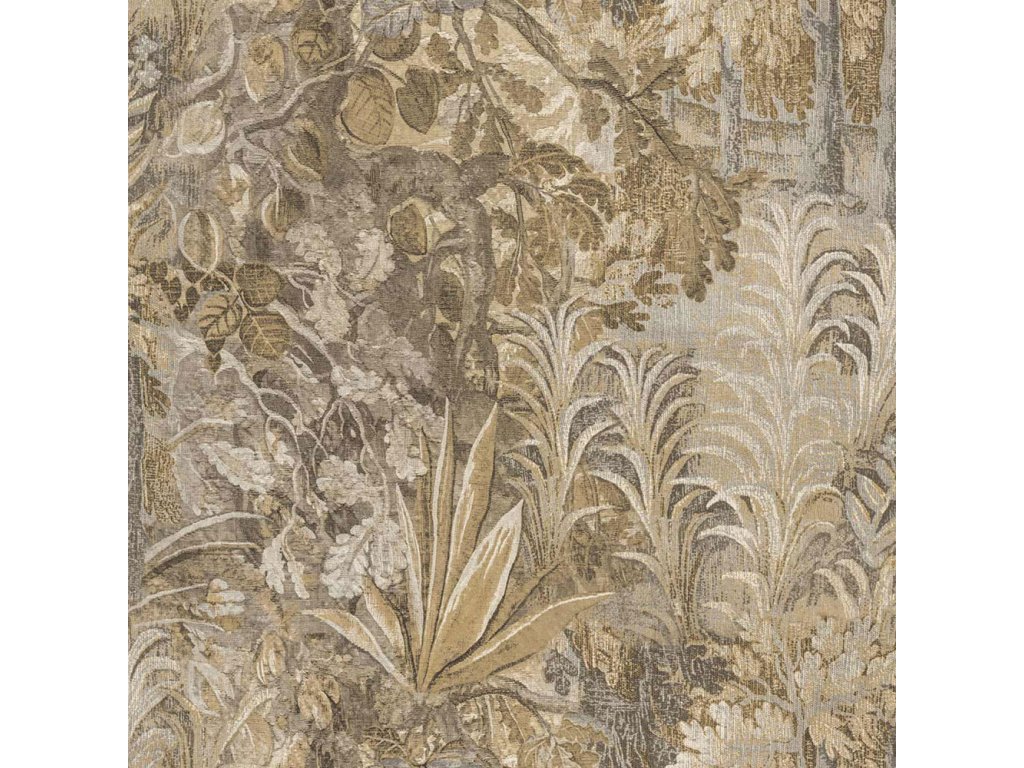 Luxusní vliesová tapeta s vinylovým povrchem, vzor evokuje textilii, rostlinné motivy, v kombinaci odstínů béžové, šedé a hnědé.