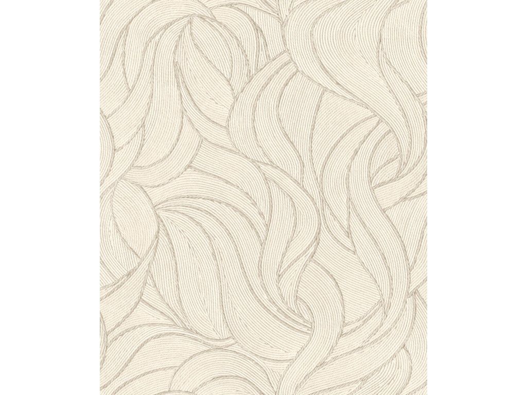 Vliesová tapeta s vinylovým povrchem, jemná textilní textura, vlnky, vzor evokuje jemné pruhy, béžová se světle hnědými vlákny tvořícími vlnky.