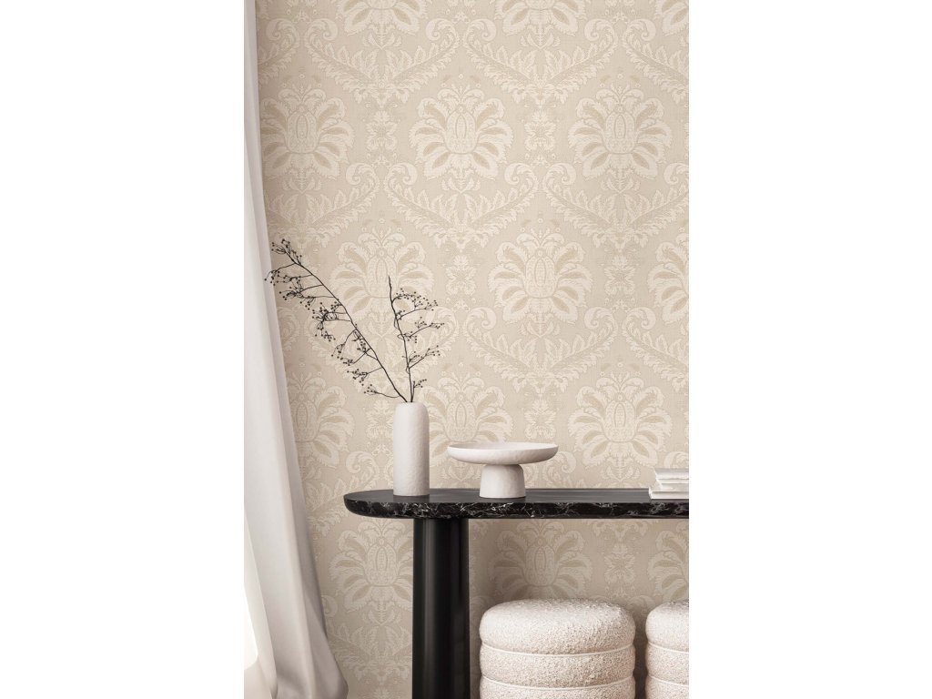 Vliesová tapeta s vinylovým povrchem, odstíny béžové, zámecký damaškový vzor, textilní struktura.