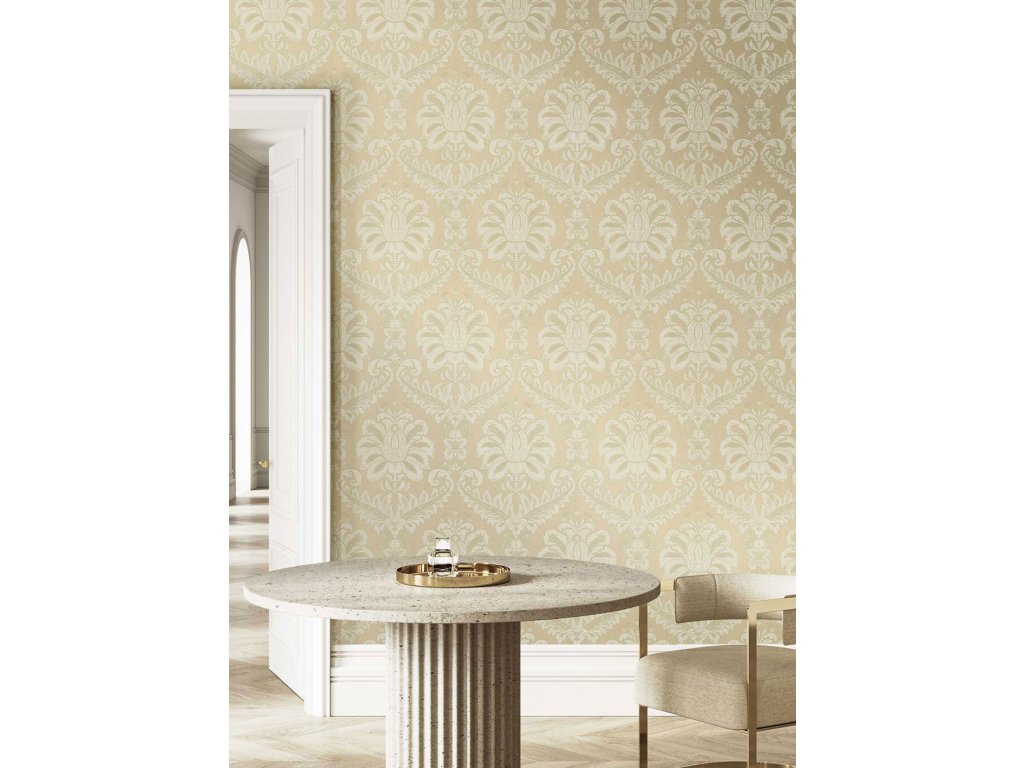 Vliesová tapeta s vinylovým povrchem, odstíny okrové a béžové, zámecký damaškový vzor s jemnými metalickými akcenty, textilní struktura.