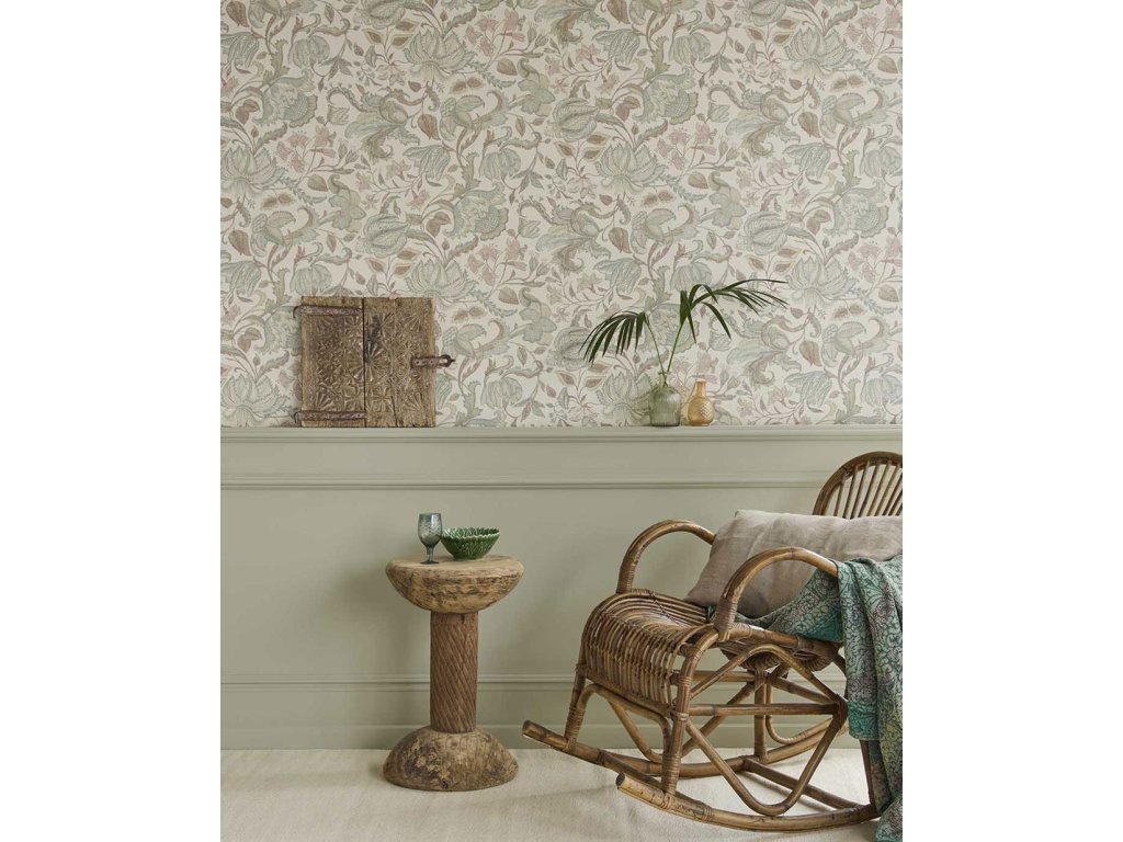 Luxusní vliesová tapeta s vinylovým povrchem, krémovo-béžový podklad s textilní strukturou, ornamentální květinový vzor v odstínech zelené a šedo-béžové a fialové.