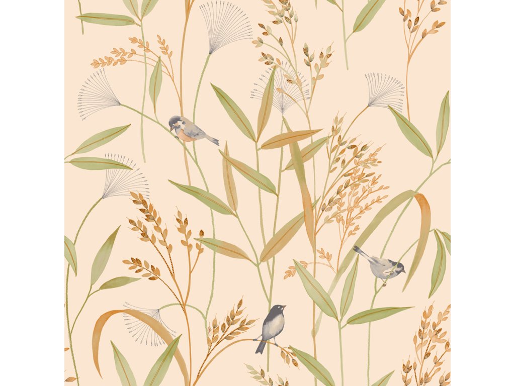 Vliesová tapeta s vinylovým povrchem, motiv lučních trav a ptáčků na světle béžovém podkladu, krupičková textura.