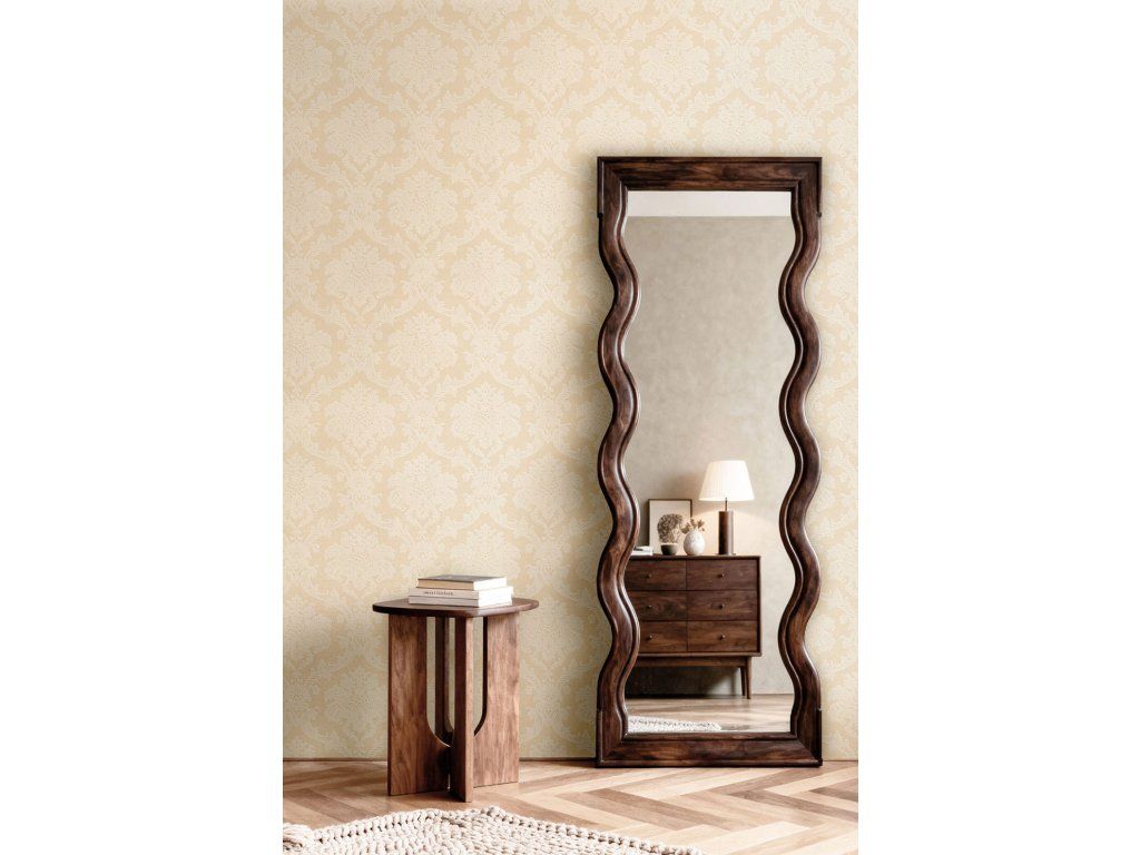 Vliesová tapeta s vinylovým povrchem, zámecký damaškový vzor, béžovo-zlatý podklad, světlý zlato-béžový vzor.