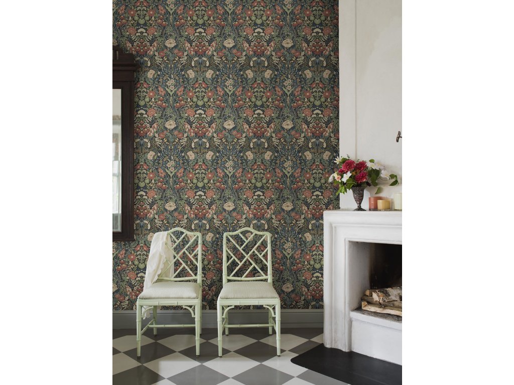 Vliesová tapeta na zeď, černý podklad, bohatý květinový vzor v odstínech zelené, modré, vínové, okrové a béžové.