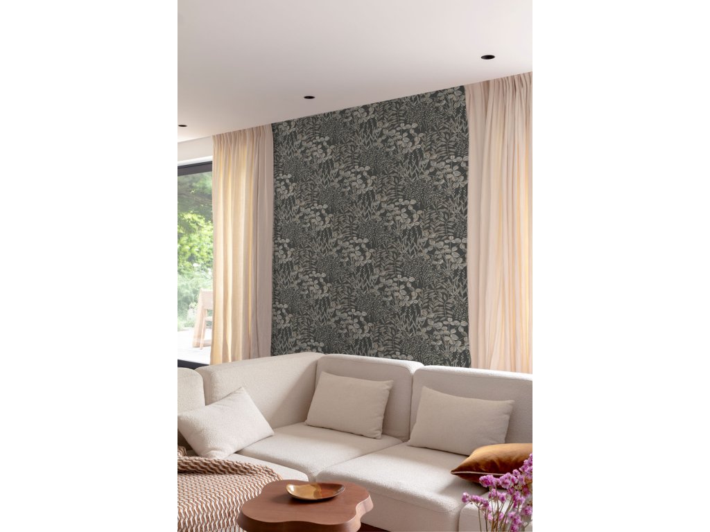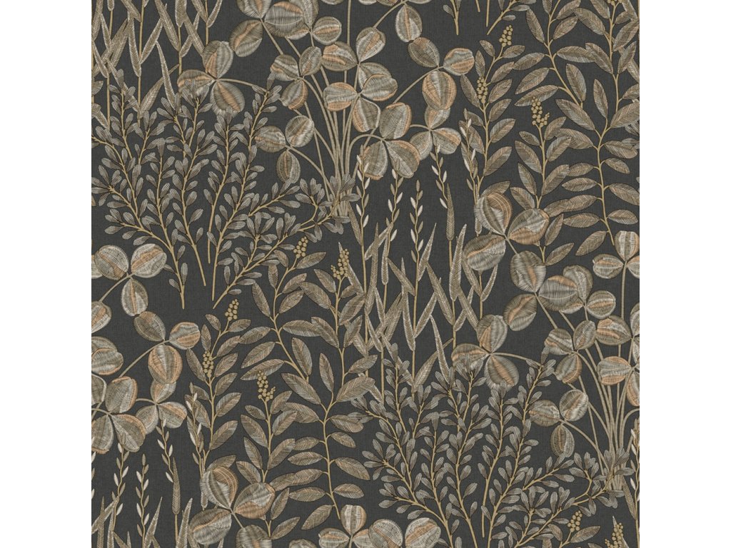 Vliesová tapeta s vinylovým povrchem, černý podklad, motiv lučních trav a listů v odstínech hnědé, zlaté stonky a detaily.