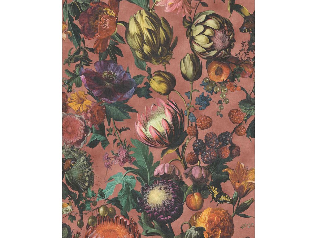 Vliesová tapeta na zeď, struktura plátna, pestrobarevný motiv květin, plodů a motýlů, podklad cihlově červený.