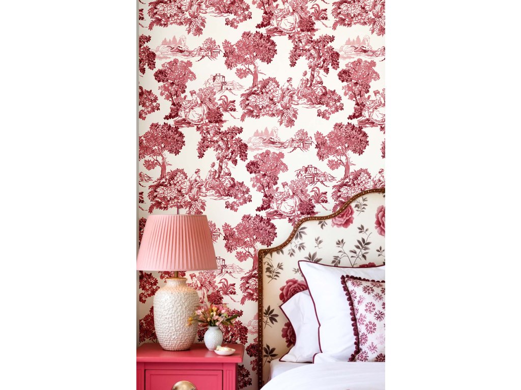 Luxusní vliesová tapeta s vinylovým povrchem, romantický motiv inspirovaný historickými látkami Toile de Jouy, bílý podklad, odstíny červené / vínové, látková textura.