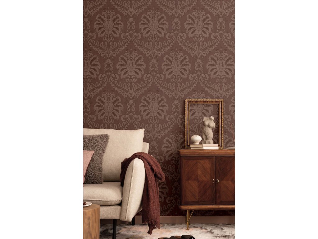 Vliesová tapeta s vinylovým povrchem, odstíny fialové a hnědé, zámecký damaškový vzor, textilní struktura.