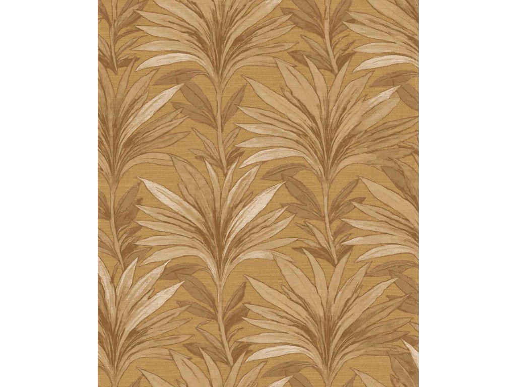 Luxusní vliesová tapeta s vinylovým povrchem, vzor evokuje textilii, listy, hnědý podklad, listy v kombinaci odstínů hnědé a béžové.