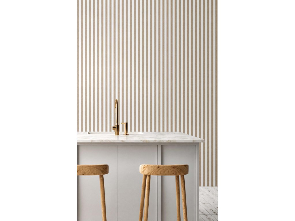 Vliesová tapeta s vinylovým povrchem, imitace proužkované látky v odstínech hnědé a bílé.