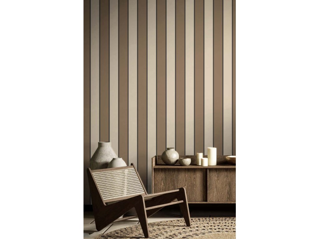 Vliesová tapeta s vinylovým povrchem, pruhy v odstínech hnědé, béžové a černé, látková textura.