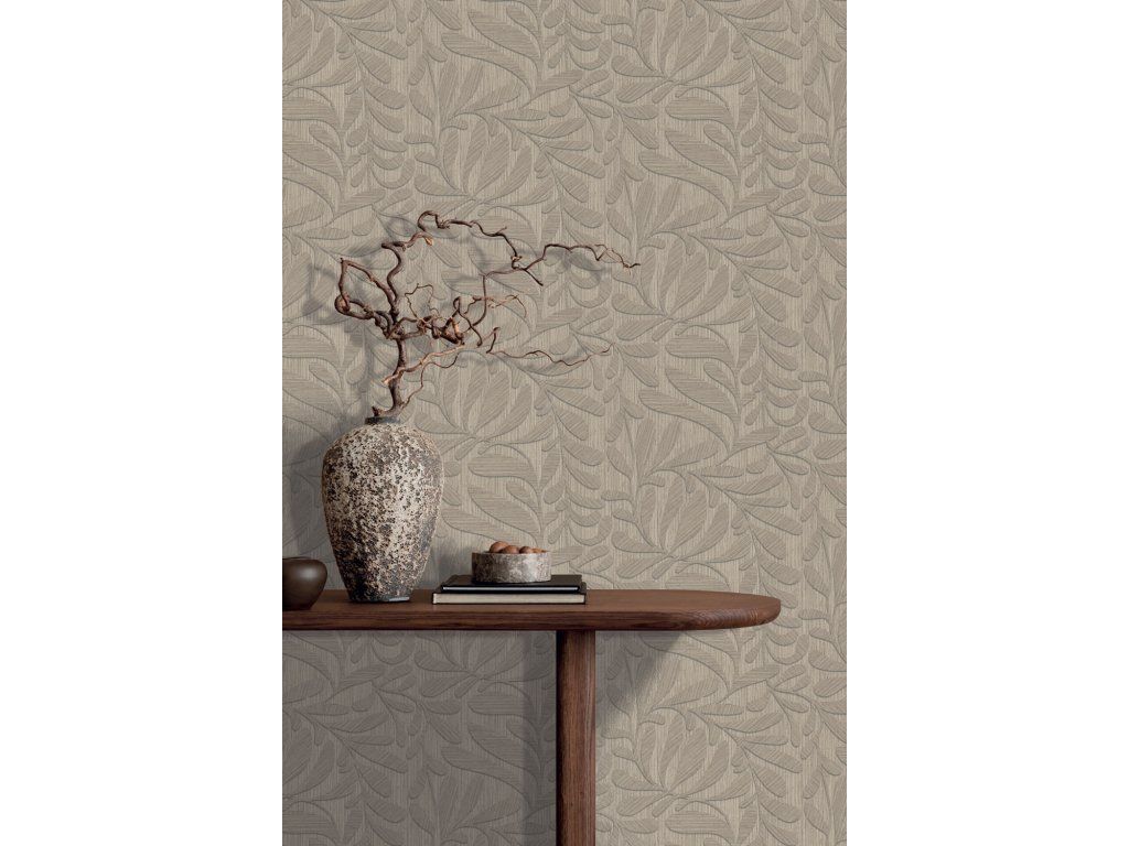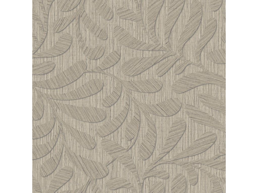 Vliesová tapeta s vinylovým povrchem, plastická textura, imitace dřeva, listy, šedo hnědá.