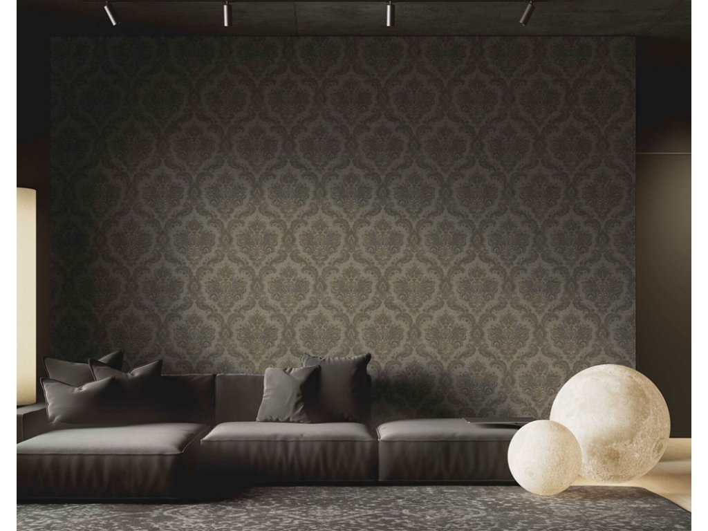 Vliesová tapeta s vinylovým povrchem, odstíny hnědé, hnědo-šedé a béžové, zámecký damaškový vzor, textilní struktura.