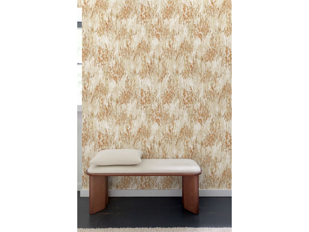 Vliesová tapeta s vinylovým povrchem, abstraktní vzor evokující přírodní materiály, odstíny hnědo-šedo-béžové, látková textura.